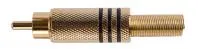 Разъем под пайку RCA папа подходит для небалансных соединений, предназначен для установки на кабель. Разъем оснащен стандартным позолоченным штекером, состоящим из центрального, выдающегося вперед штыря, окруженного металлическим круглым ободком. Корпус разъема разборный, металлический, с рифленой позолоченной поверхностью, которая позволяет удобно держать штекер. В качестве протектора использована металлическая кабельная пружина под цвет корпуса. Разъём RCA широко используется для передачи аудио и видео сигнала в профессиональной технике, а также бытовой аппаратуре.Характеристики и возможности