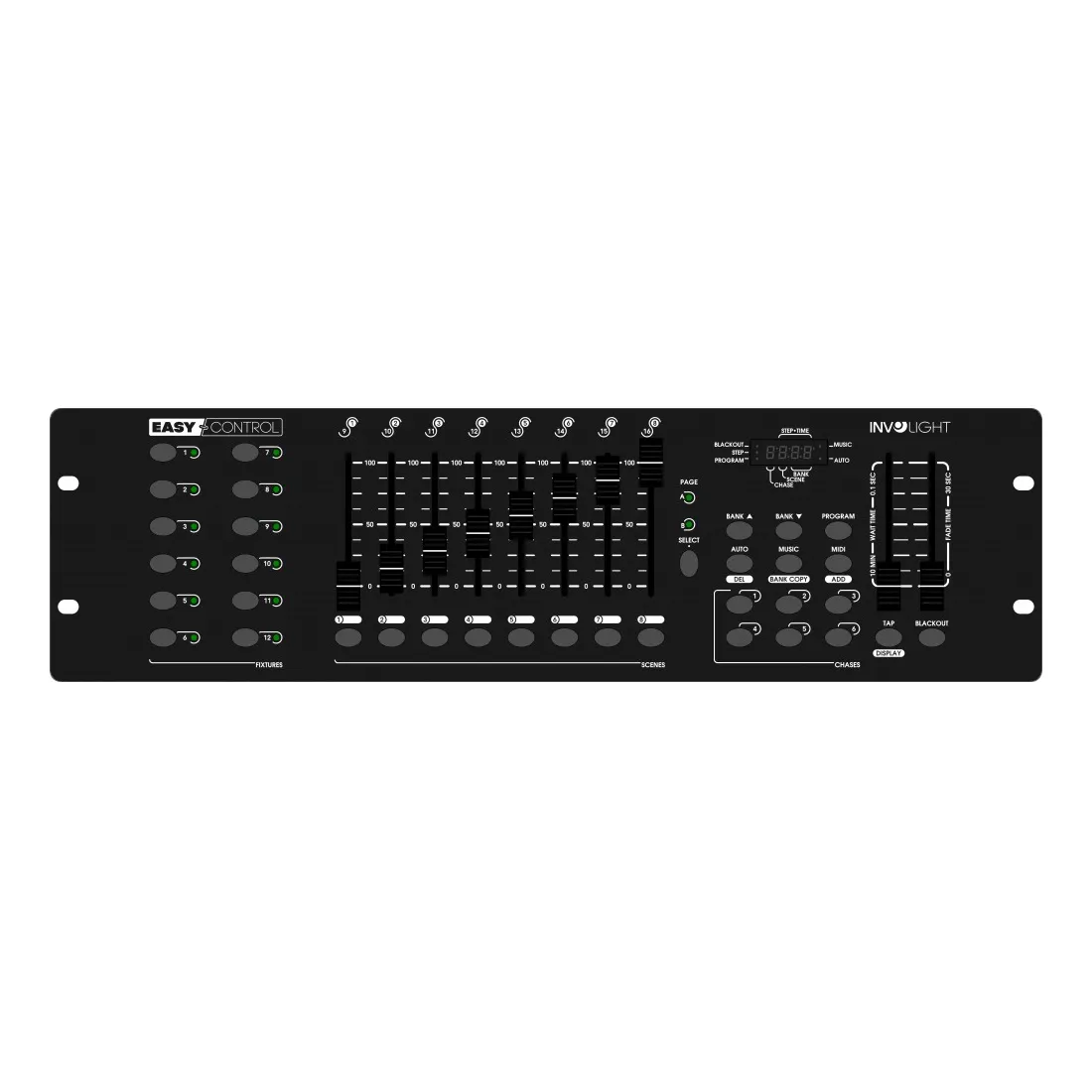 Involight EASYControl — это DMX-контроллер для 12 световых приборов с 16 каналами управления каждый. Имеет 8 фейдеров, 184 программируемых сцены и 6 программируемых Чейзов. Воспроизводит «Чейзы» вручную, в авторежиме или от звуковой активации. Работает от музыки через встроенный микрофон. Есть функция Blackout. Поддерживает USB для подключения светодиодной лампы. Размеры — 19" для рэковых стоек. Питание: DC 9/12В, 500мА.