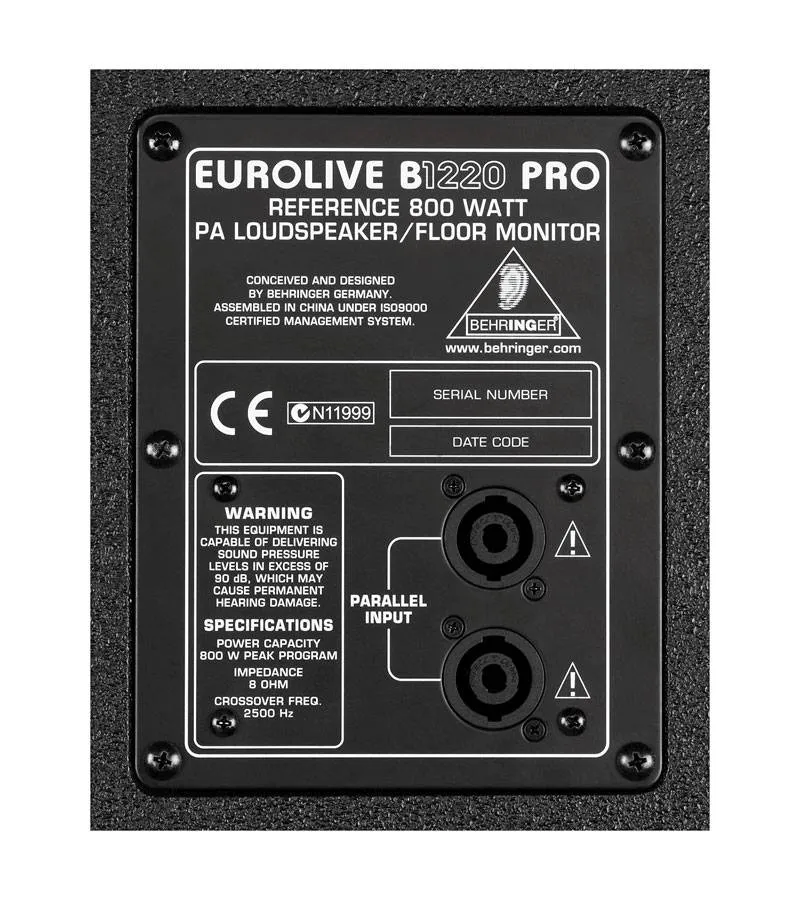 EUROLIVE B1220 PRO – динамик, работающий при номинальной мощности 800 Вт, чего хватает для интеграции в аудиосистемы для больших концертных помещений, рассчитанных на сотни человек. Пиковая мощность динамика составляет 1200 Вт – этого достаточно, чтобы не беспокоиться о превышениях уровня сигнала и возможных поломках. Твиттер от перегрузок дополнительно защищён встроенным лимитером. Максимальное звуковое давление динамика составляет 95 дБ SPL. Импеданс EUROLIVE B1220 PRO равняется 8 Ом.