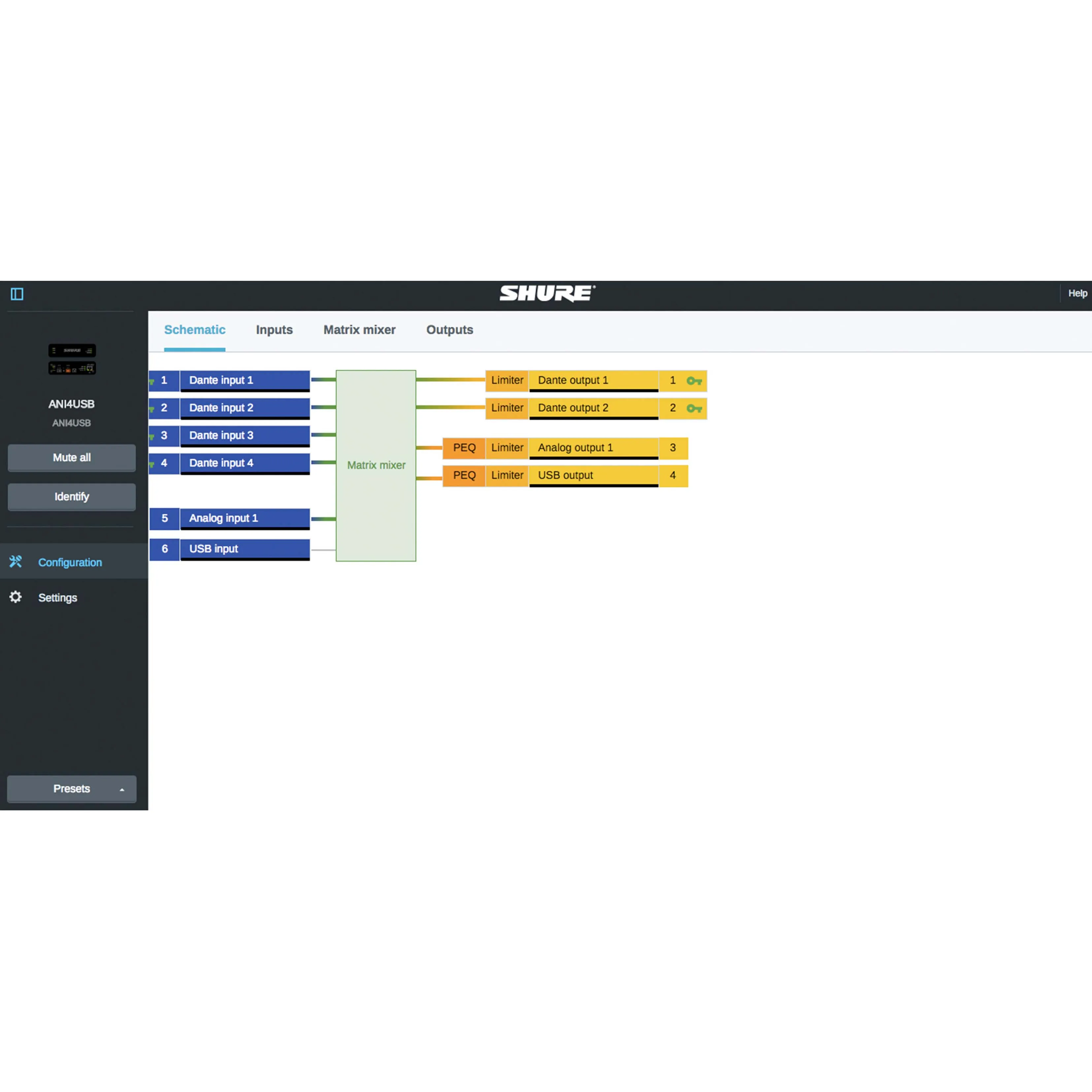 ANIUSB-MATRIX позволяет подключить 4 микрофонных канала Microflex Advance или Microflex Wireless через интерфейс Dante (4 входа / 2 выхода) и обеспечивает возможности аналогового подключения (1 блочный вход / 1 блочный выход) к имеющейся в помещении системе аудио/видеоконференцсвязи или компьютерному приложению для A/V-конференций через интерфейс USB (1 вход/выход).
