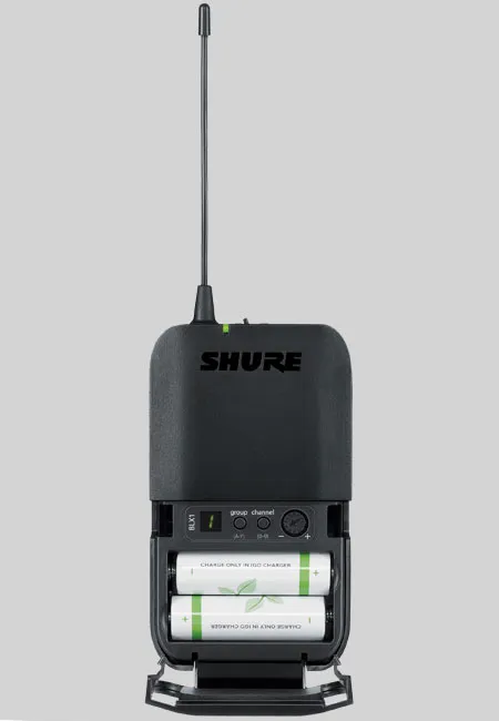 Компактный передатчик для беспроводных систем BLX работает на расстоянии до 100 метров. Имеет регулятор уровня сигнала и кнопку включения/отключения. Питание от двух батареек АА 1,5 В. Время работы до 14 часов. Индикация заряда на корпусе. Лёгкий (75 г) и компактный (11 см х 6,4 см х 2,1 см). Диапазон частот: 662–686 МГц.
