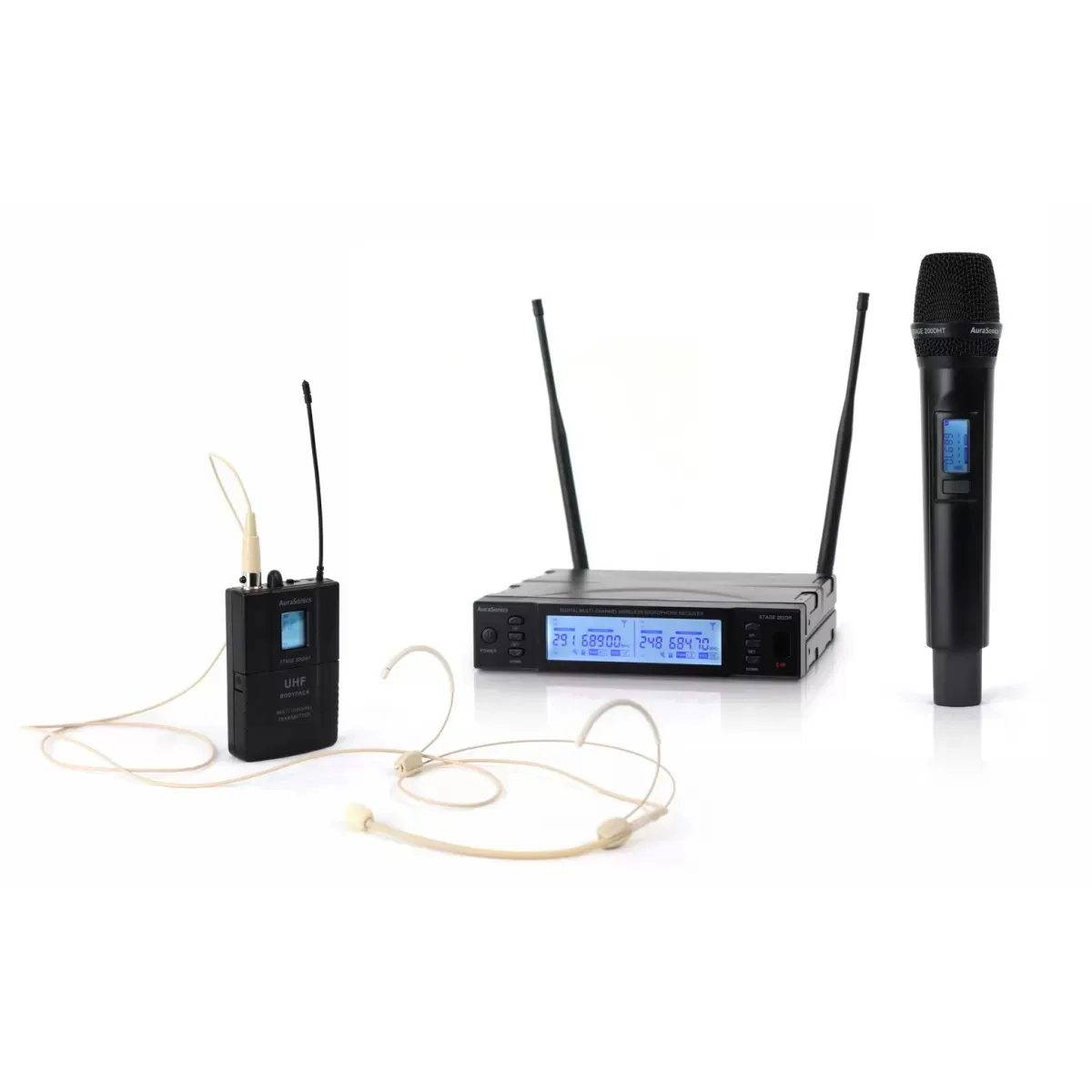 Радиосистема AuraSonics STAGE 202 MIX — цифровая система с ручным и поясным передатчиками и двухканальным приёмником. Работает на частоте 660–690 МГц с модуляцией 4DQPSK. Дальность действия до 80 м. Имеет 299 частот, возможность поиска свободного канала. Оснащена индикаторами уровня сигнала и заряда батареи. Поддерживает программирование передатчиков через ИК-порт. Выходные коннекторы: 2 балансных XLR и общий небалансный выход MIX на Jack.