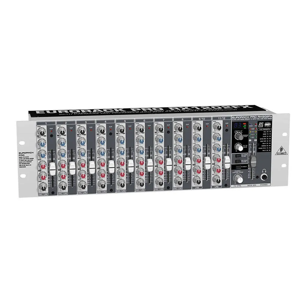 Behringer RX1202FX V2 — рэковый микшерный пульт серии Eurorack Pro, версия 2. Обновлённая модель 12-канального микшера с 8 моно-каналами и 2 стереопарами. Встроенным FX-процессором и фантомным питанием +48 В. Поддерживает установку в 19-дюймовую стойку (3 юнита).