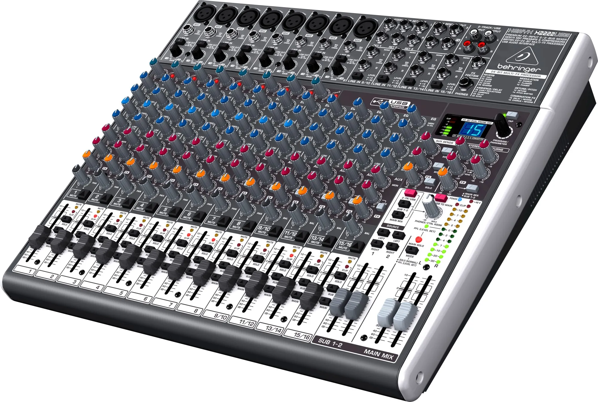В арсенале этого микшерного пульта обновленный 24-битный процессор мультиэффектов, в котором уже есть 16 встроенных предустановок и свободным местом для сохранения Ваших настроек. Обратите внимание, Вы всегда можно отредактировать имеющиеся прессеты под свои нужды.