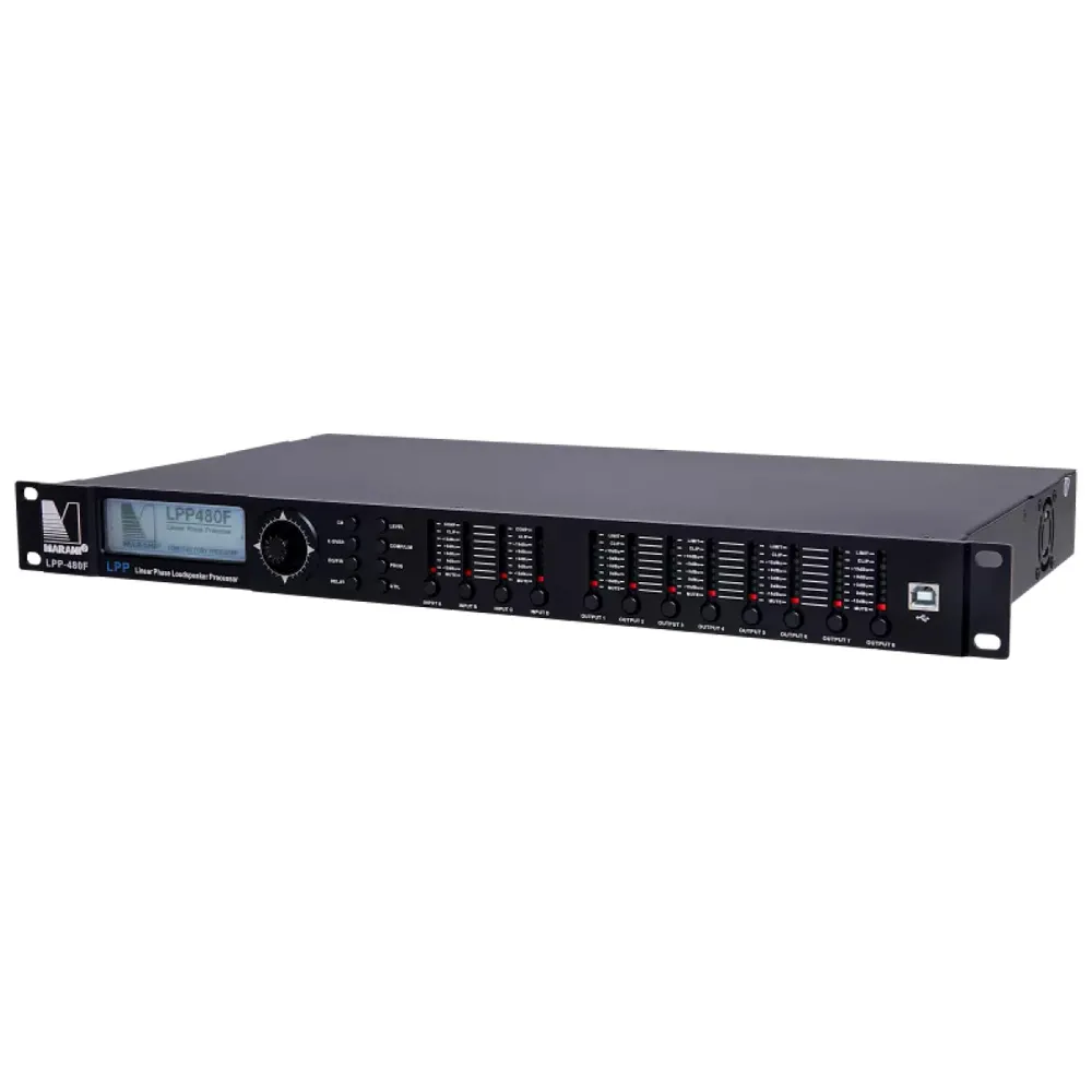 Аудиопроцессор Marani LPP480F — это цифровой контроллер для акустических систем. У него 4 входа и 8 выходов. Поддерживает звук до 96 кГц и 24-битное разрешение. Оснащён DSP-движками и эквалайзерами. Есть матричное микширование и возможность удалённой настройки через USB/TCP-IP. На передней панели — ЖК-дисплей с синей подсветкой.