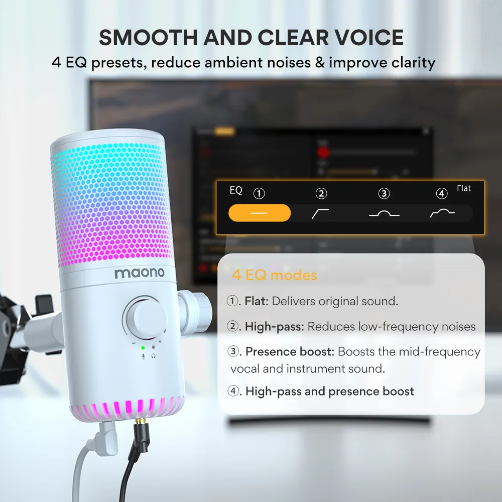 Микрофон Maono DM30RGB White — обновлённая модель с RGB-подсветкой. Подходит для игр благодаря кардиоидной направленности и ползунку регулировки звука. Подключение через USB-C.