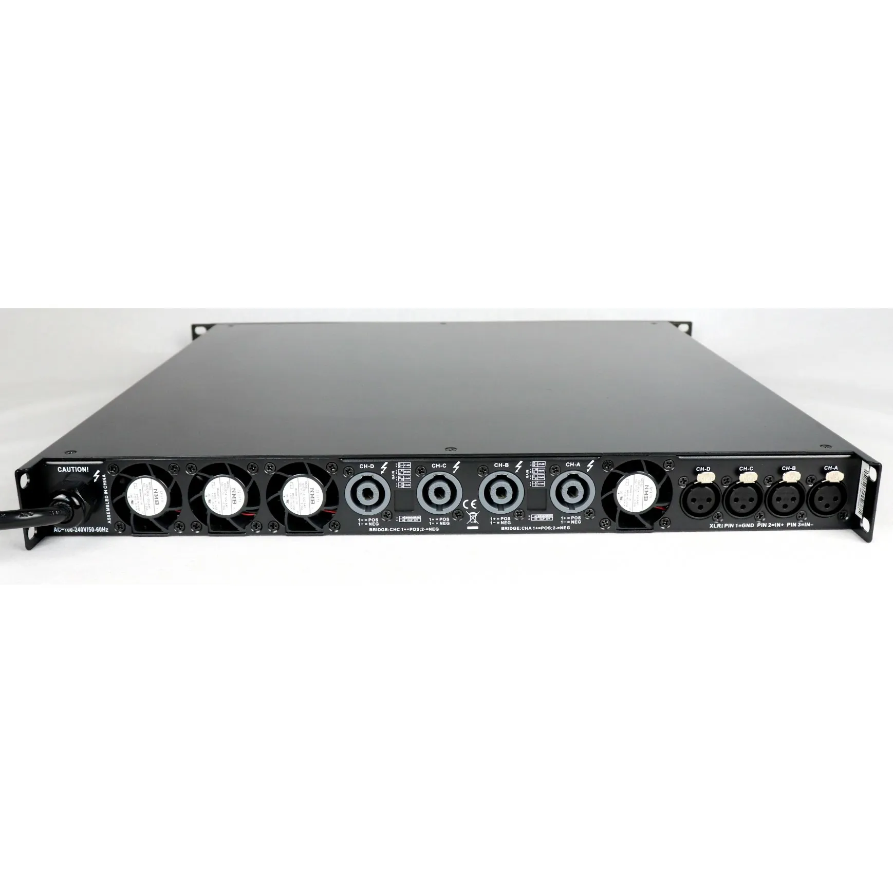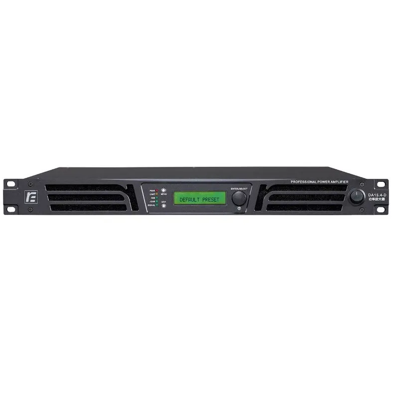 RFIntell DA15.4-D — 4-канальный усилитель класса D с 24-битным DSP. Мощность: 8 Ом — 4×1500 Вт, 4 Ом — 4×2550 Вт, 2 Ом — 4×3400 Вт. Мостовая мощность: 8 Ом — 2×4500 Вт, 4 Ом — 2×6800 Вт. Диапазон частот: 20–25 кГц. Входы — XLR, выходы — Speakon. Функции: эквализация, задержка, мониторинг через компьютер.